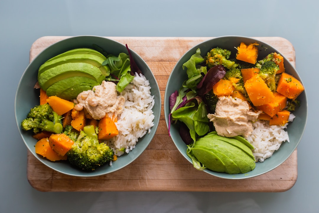 Top each bowl with broccoli, a salmon fillet, edamame and sliced avocado.